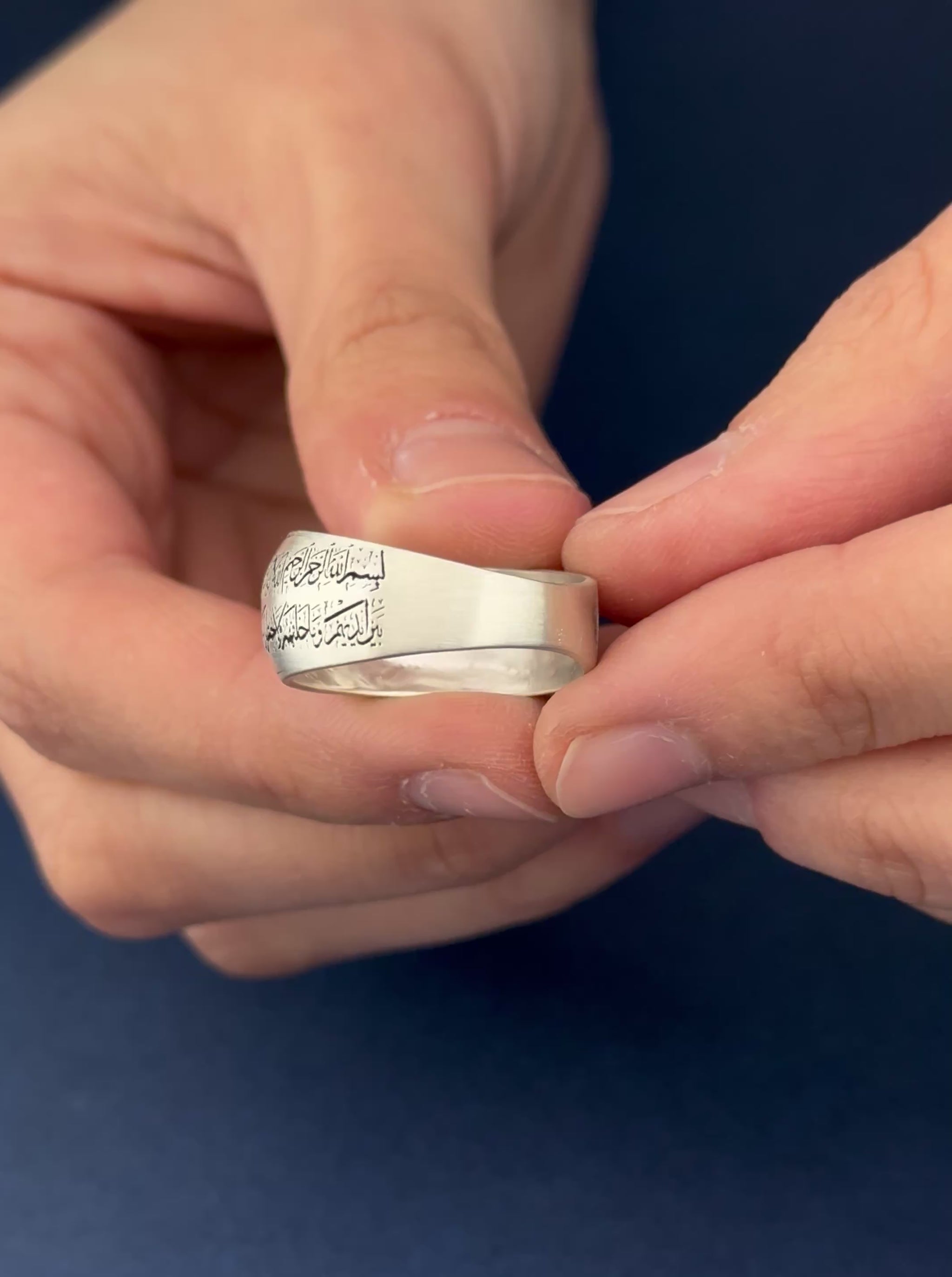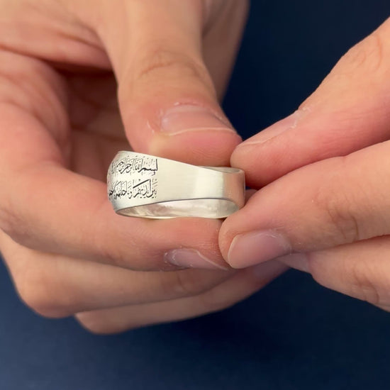 Bu zarif ve anlamlı gümüş alyans, İslami motifleri ve Kuran-ı Kerim’den seçilen ayetleri, duaları veya sembolleri içerecek şekilde kişiselleştirilebilir. En az 8 gram ağırlığında olan bu özel yüzüğün hem iç hem de dış yüzeyine istediğiniz ayet, dua, isim veya sembol işlenebilir.